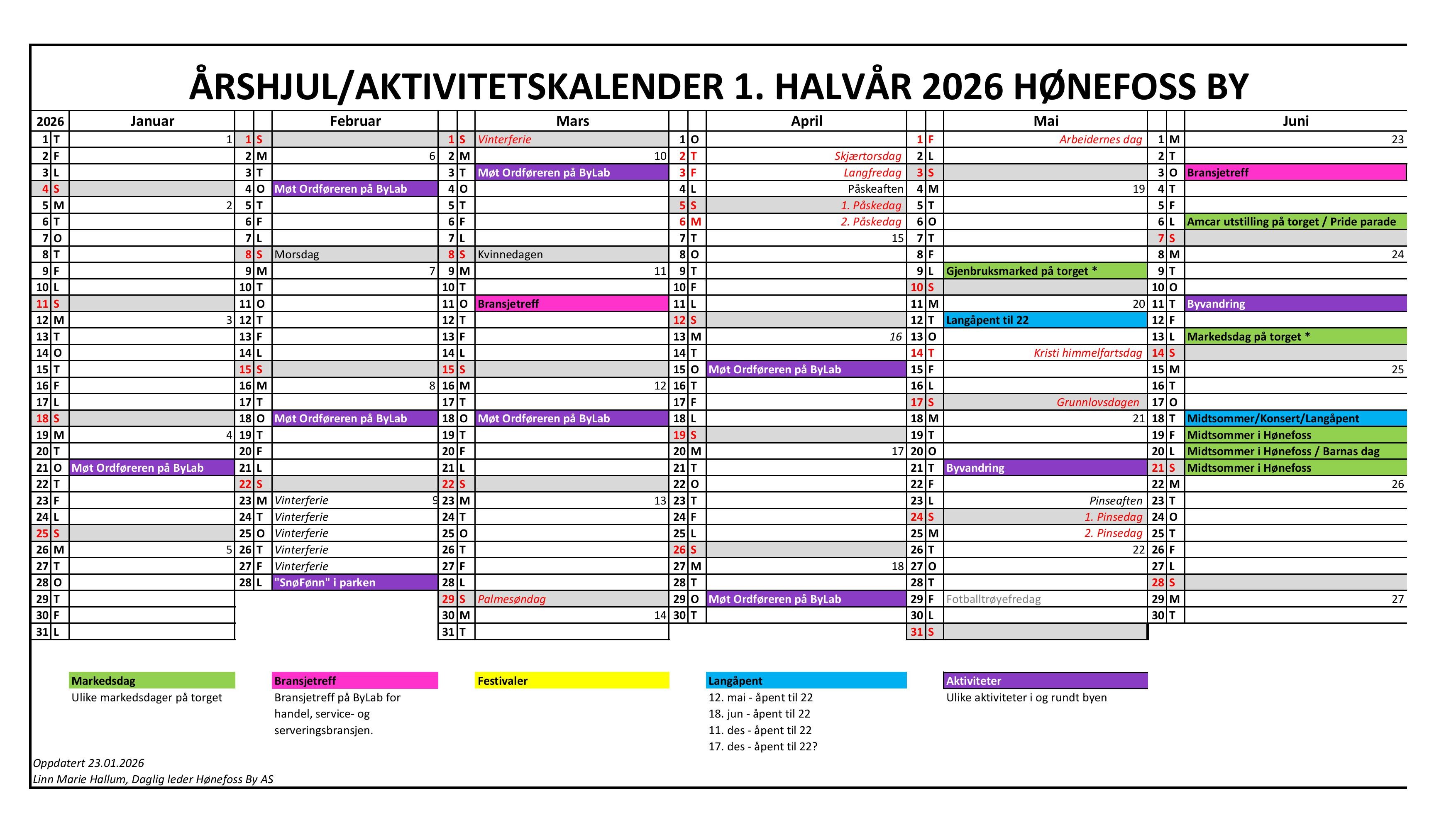 Årshjulaktivitetene er en oversikt over planlagte aktiviteter i og rundt Hønefoss sentrum. Kalenderen er dynamisk, og endringer vil forekomme, merk dato for siste oppdatering.