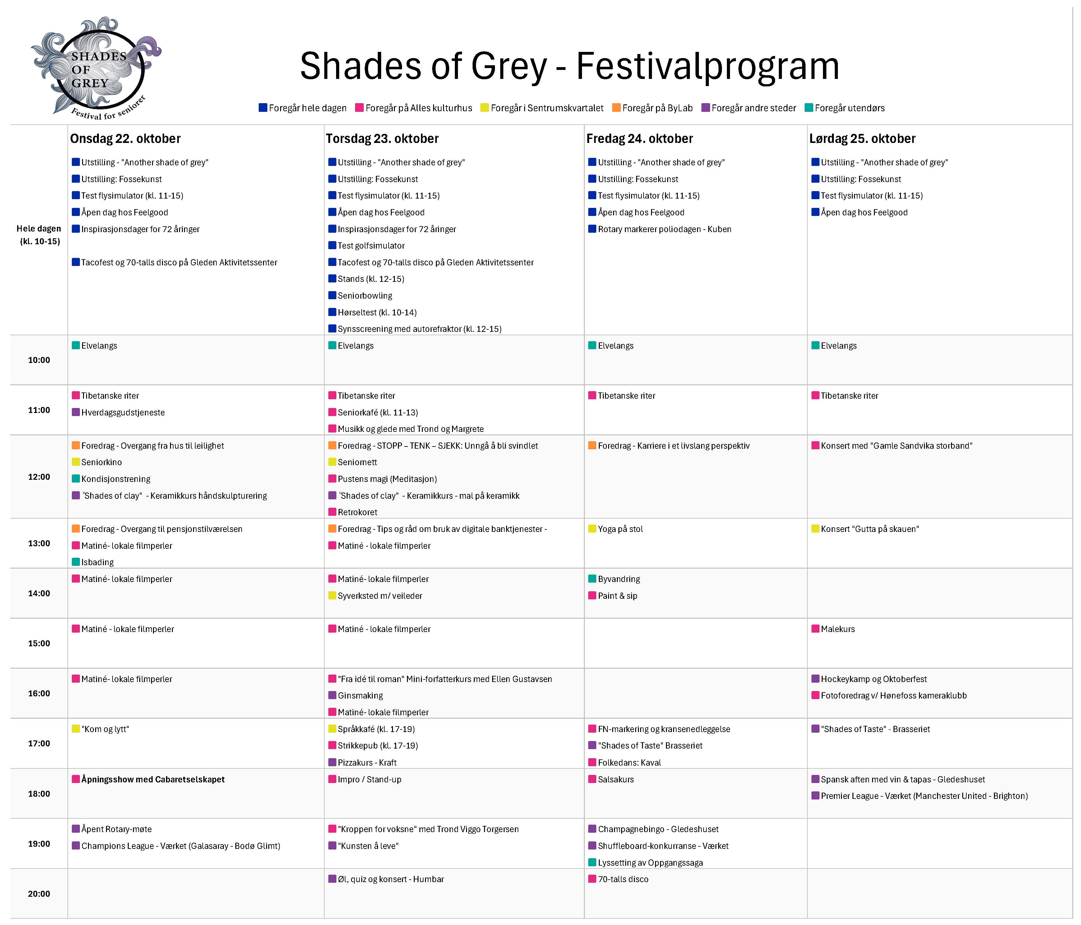 Velkommen til en helt ny festivalopplevelse i Hønefoss! I fire dager, fra onsdag 22. oktober til lørdag 25. oktober fylles Hønefoss med aktivitet, glede og fellesskap når vi for aller første gang arrangerer Shades of Grey – en festival for seniorene!