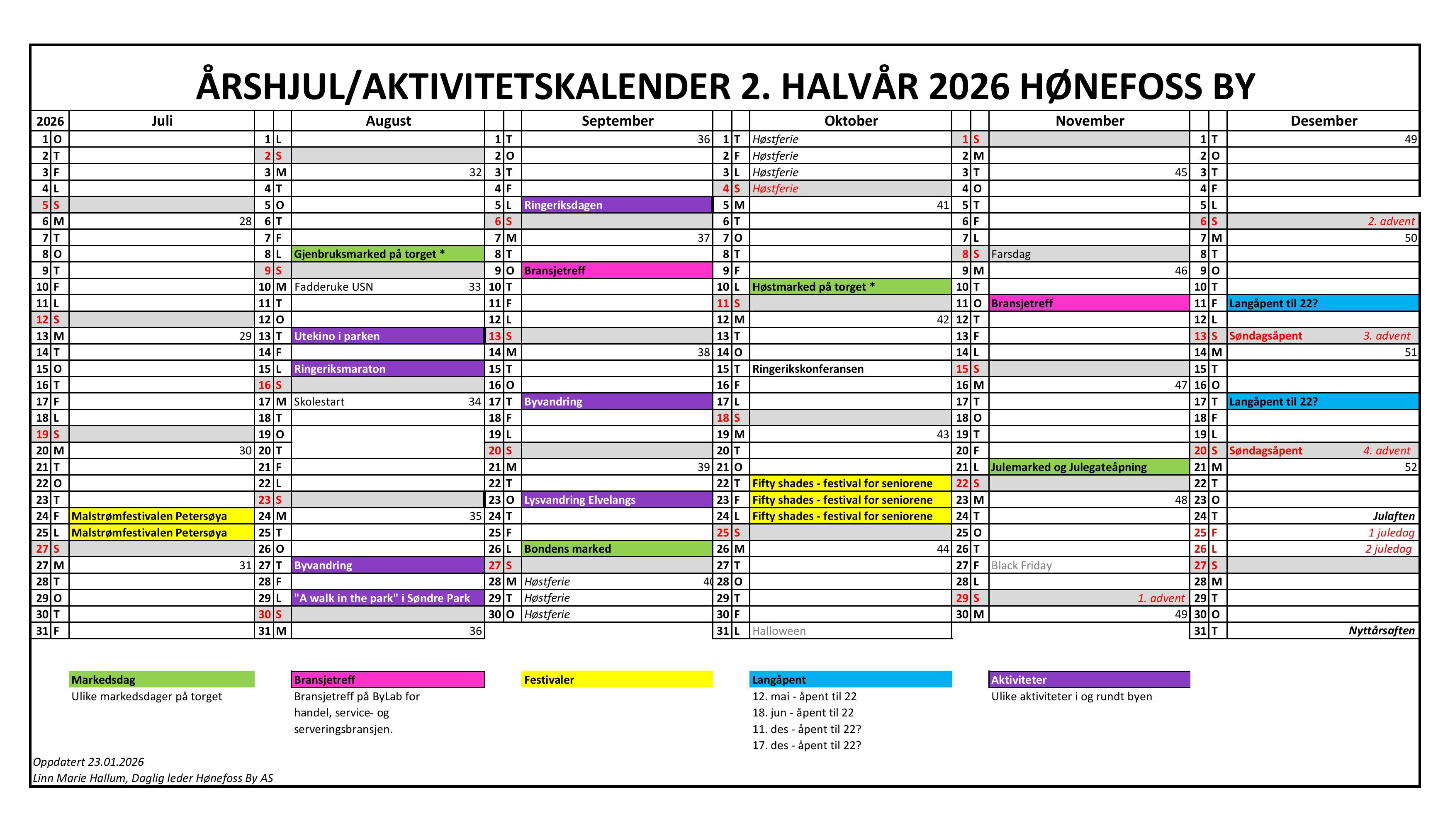 Årshjulaktivitetene er en oversikt over planlagte aktiviteter i og rundt Hønefoss sentrum. Kalenderen er dynamisk, og endringer vil forekomme, merk dato for siste oppdatering.